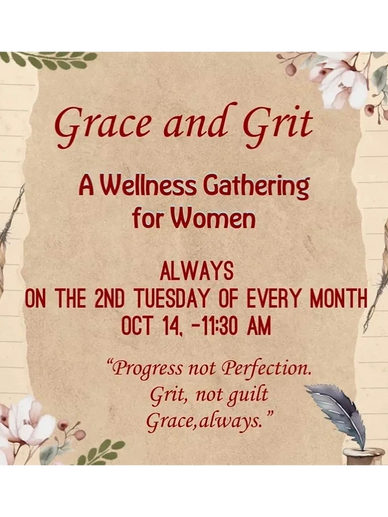 Grace and Grit is a welcoming , once-a-month wellness gathering designed to help you build healthy habits with compassion and consistency. We combine a short practical teaching (think: stress, sleep,hormones,food,mindset,movement you'll actually do) a guided reflection , and a doable action step you can start today. And its FREE!